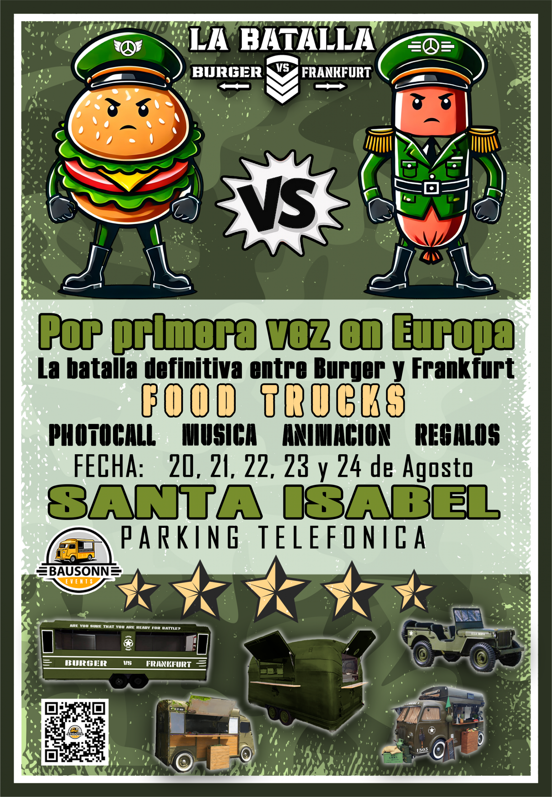 Enfréntate a la misión de elegir tu bando en este campo de batalla gastronómico, donde food trucks rivales se enfrentarán con sus mejores armas: jugosas hamburguesas y sabrosos frankfurts. La zona de combate estará ambientada con estilo militar, repleta de camuflaje y equipamiento táctico.